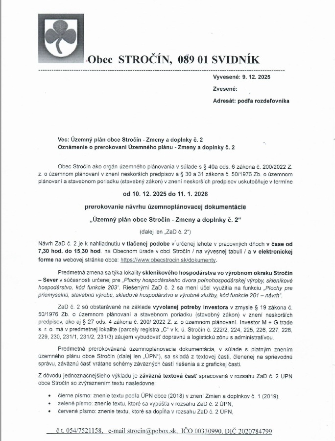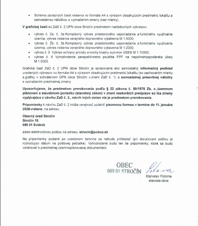 Oznámenie o prerokovaní Územného plánu obce Stročín - Zmeny a doplnky č. 2