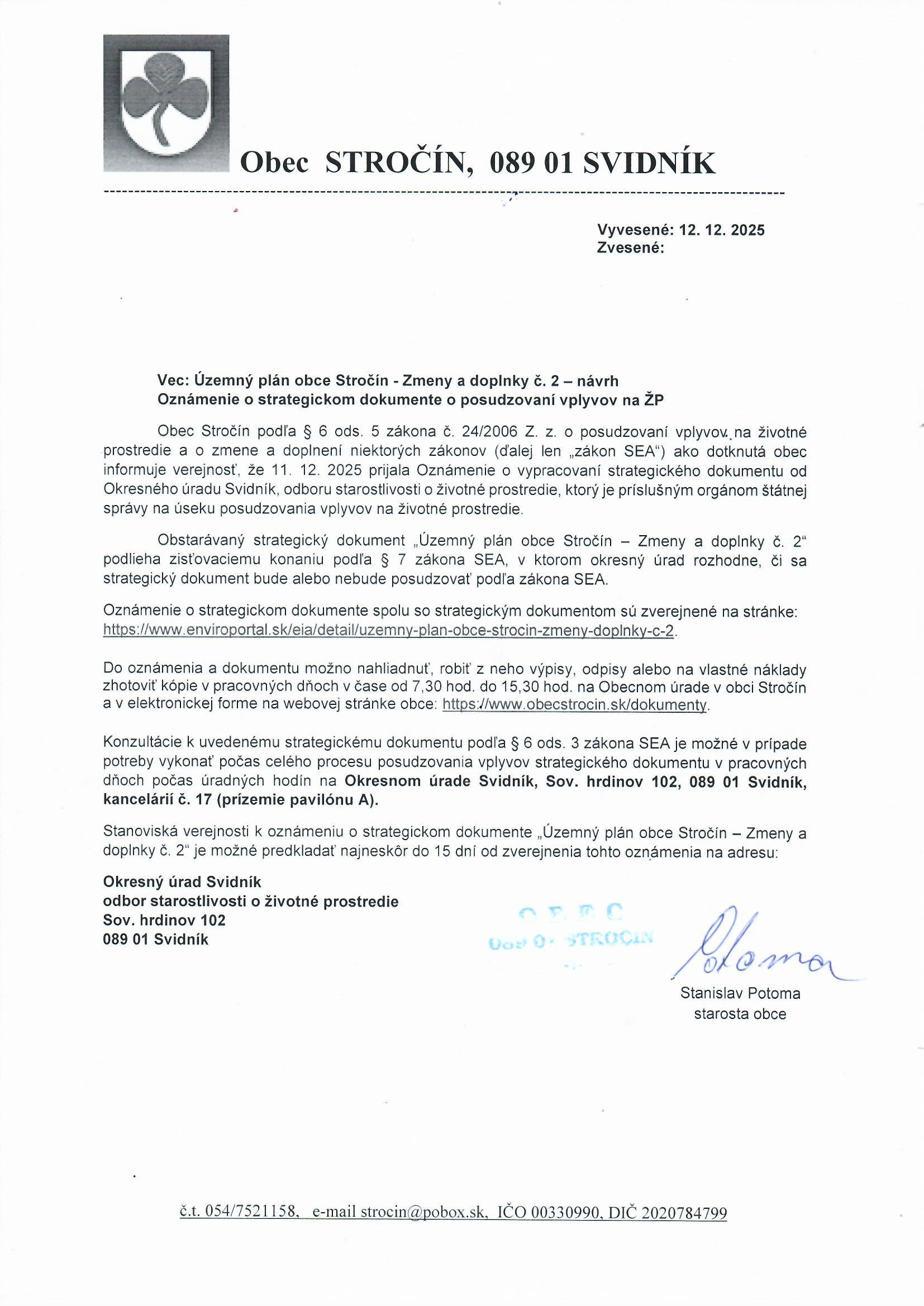 ÚPN obce Stročín- Oznámenie o strategickom dokumente o posudzovaní vplyvov na ŽP