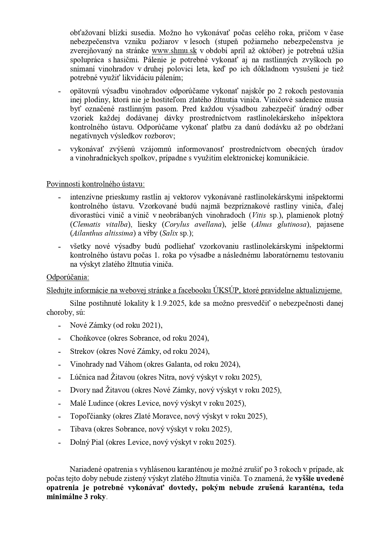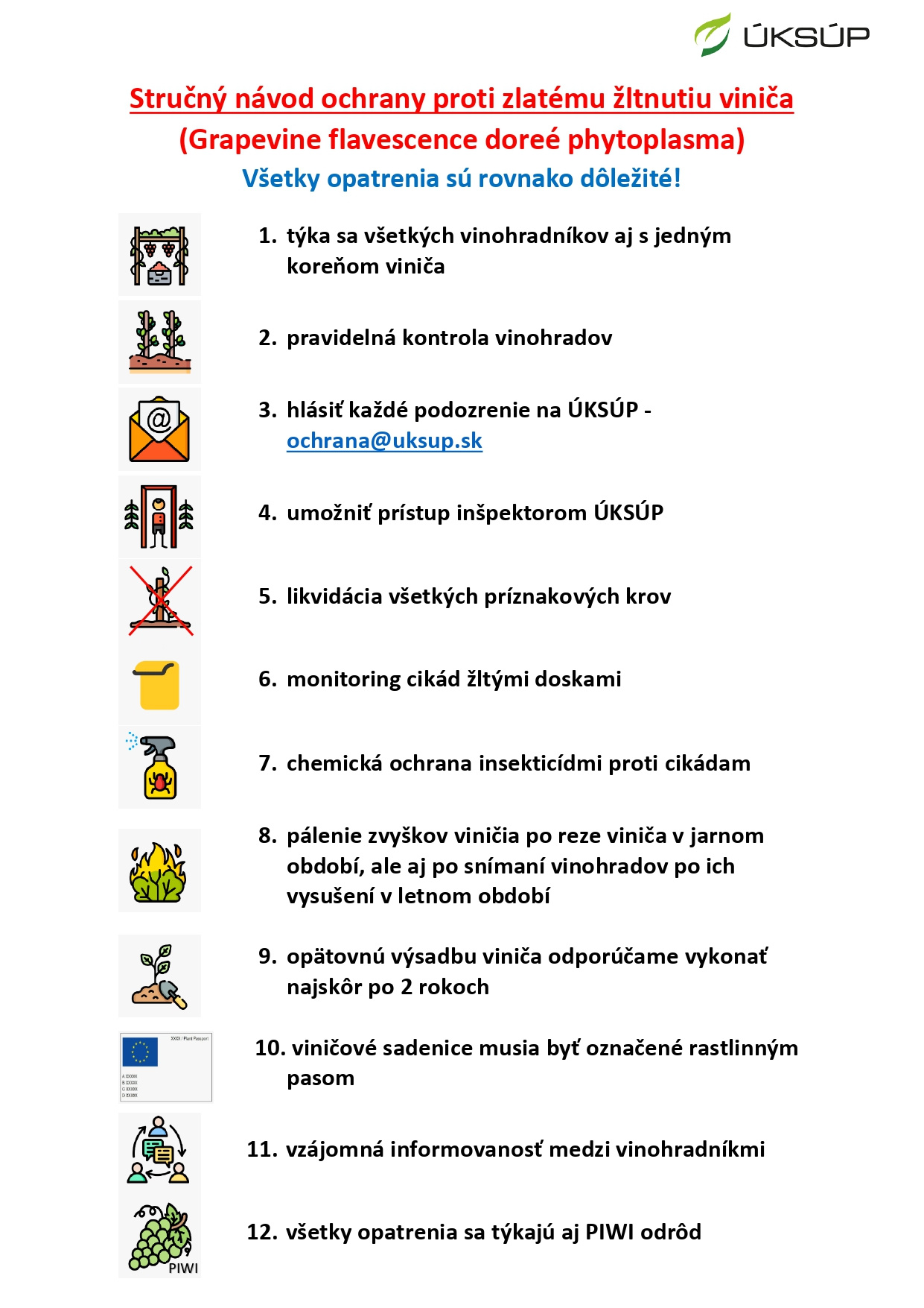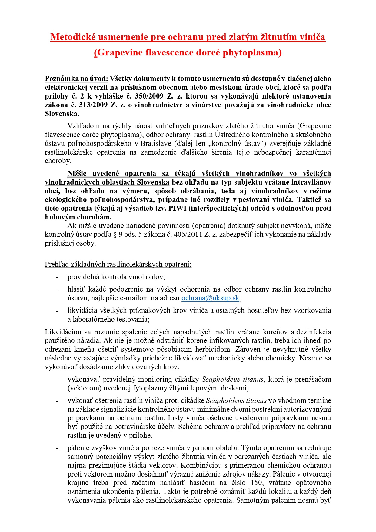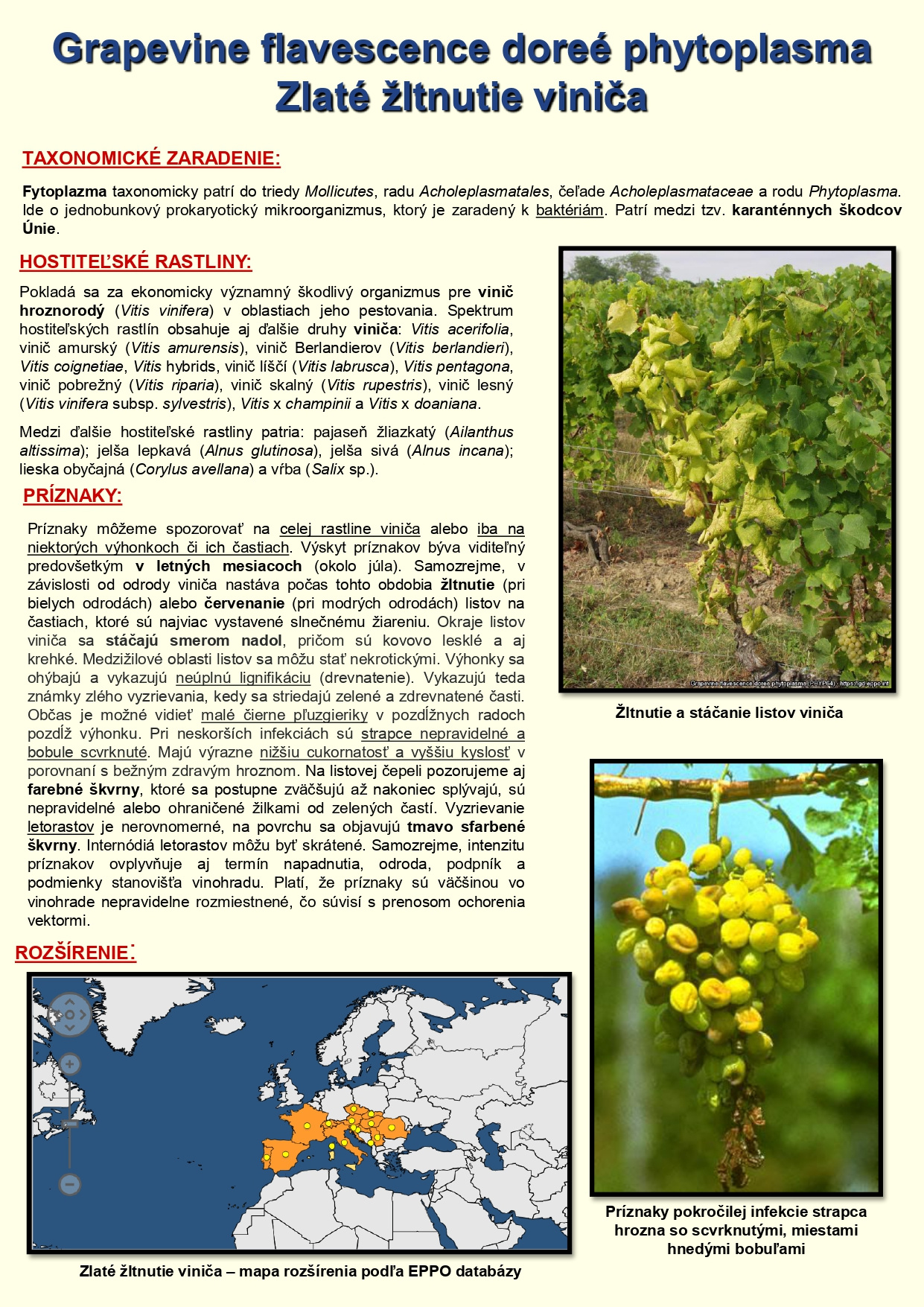 Vzhľadom na rýchly nárast viditeľných príznakov karanténnej choroby viniča s názvom zlaté žltnutia viniča (Grapevine flavescence dorée phytoplasma) na území Slovenska, Vám Ústredný kontrolný a skúšobný ústav poľnohospodársky v Bratislave poskytuje aktualizované naliehavé upozornenie na zamedzenie šírenia tejto choroby.