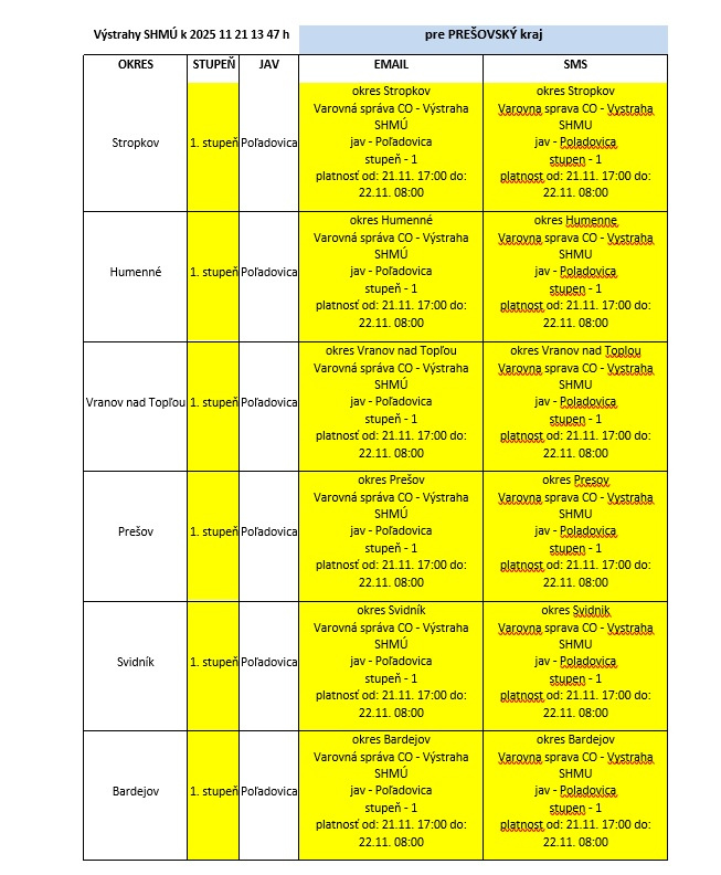 UPOZORŇUJEME občanov, že SHMÚ vydal výstrahu 1. stupňa pred poľadovicou, ktorá platí aj pre okres Svidník. Prosíme Vás, aby ste na seba dávali pozor.